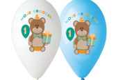 W opakowaniu znajduje się 5 błękitno-białych balonów z kolorowym napisem: